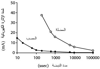 الشكل (1) منحني شدة الإثارة الكهربائية – مدة النبضة للعصب والعضلة.