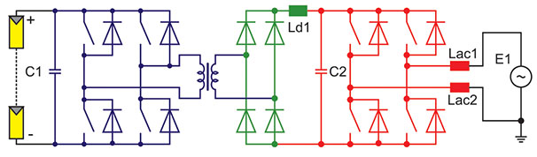 | الشكل (5) تحويل توتر الخلايا الشمسية المستمر إلى توتر متناوب وتنظيمه وحقنه في الشبكة. |