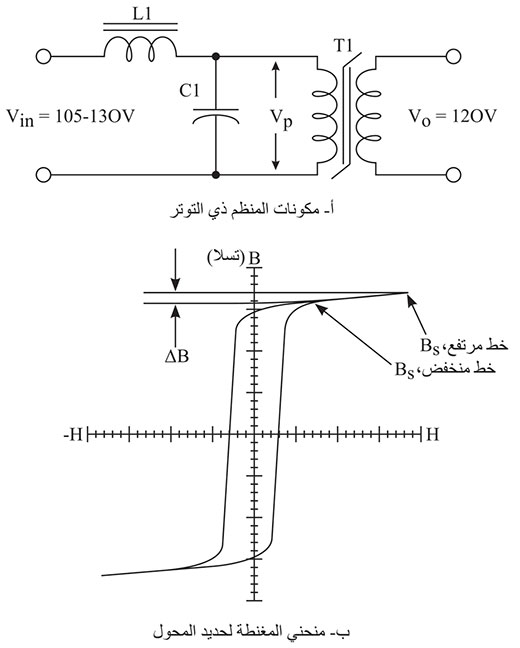 ويكون تنظيم التوتر تابعاً لشكل منحني بطاء (مغنطة) حديد المحول المستخدم، ويجب أن يكون منحني الخواص ضيقاً وقائماً. تعتمد كثافة الفيض المغنطيسي B على نوعية المواد المغنطيسية المستخدمة، ولكل شركة صانعة مكوناتها وتجربتها في تحديد فترة الإشباع ومجال تنظيم التوتر.