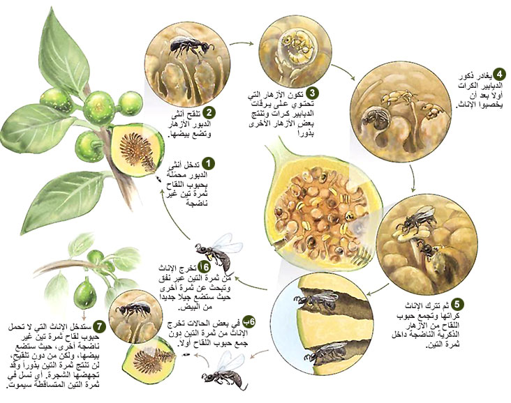 · آلية التلقيح: عند خروج الحشرات البالغة من ثمار الذكار تحتك بمتوك الأزهار المذكرة وتعلق حبوب اللقاح بجسدها، ثم تدخل ثمار التين الأنثوية عبر فتحة صغيرة (النقير) لتلقيحها (الشكل 2).
