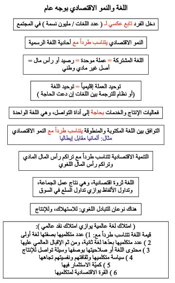 - تقول نظرية النمو التقليدية إنّ النمو الاقتصادي تابع لعاملي رأس المال والعمالة؛ فيما تنص نظرية النمو الجديدة على أن معدل هذا النمو يتناسب مع المستوى المعرفي ومع معدل تنامي هذا المستوى. ويدخل في المستوى المعرفي كلُّ ما يتعلق بالقوى العاملة أو رأس المال البشري. وتعد معرفة القوى العاملة للغة العلمية والتقانية -كلٌّ بحسب حقله وحاجته- من المركبات الأساسية لرأس المال؛ إذ إن اللغة هي وعاء المعرفة ولها وظائفها الاقتصادية.