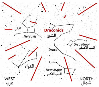 بدءاً من مستهل شهر تشرين الأول /أكتوبر وحتى منتصفه من كلِّ عام تصدر عن رأس التنين شهب مضيئة كوابل النيازك showerتدعى التنينيات (الدراكونيات) Draconids (الشكل 11). كذلك اكُتشف في الرابع من شهر شباط/فبراير من العام 2011 وابلُ نيازك عرف باسم فبراير إيتا دراكونيات February Eta Draconids، ولوحظ آنئذ انطلاق ستة نيازك من نقطة مشتركة في فترة قصيرة من مذنب مديد الدورة long-period comet لم يكن معروفاً من قبل.