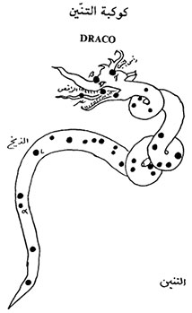 يقول الفلكي الحسين بن عبد الرحمن بن عمر الرازي الصوفي في كتابه صور الكواكب: " كواكب (نجوم) التنين 31 كوكباً وليس حولها شيء من الكواكب المرصودة، وابتداؤها أربعة نجوم على الرأس بين الفرقدين وبين النسر الواقع على مربع منحرف، فيمر في ناحية الشمال حتى ينتهي إلى كواكب مجتمعة في أغلظ موقع من الصورة؛ والعرب تطلق على الأول الذي على طرف اللسان اسم الراقص، والأربعة التي على الرأس العوائذ (الشكل 5) وهي الثاني والثالث والرابع والخامس". تُصوَّر العوائذ على هيئة نوق camels أربع تحمي فرشها (ولد الجمل)، وهو نجم معتم، مؤلف من ضبعين أو ذئبين أو عوهقين (عوقهين عند الصوفي رقمهما 24 و 25) يمثلهما النجمان إيتا دراكونيس Eta Draconis وزيتا دراكونيس Zeta Draconis ، وثمة ناقة خامسة تتجه نحوهم، ويصور البدوي الذي يرعى تلك النوق بمثلث الأثافي (حجارة الموقد) الذي يضم النجوم إبسلون Upsilon وتاو Tau وسيغما دراكونيس Sigma (عند الصوفي الكواكب 16 و15 و14). وتشتمل "أرجوزة أبهى المواكب" في شرح الكواكب على وصف" لكوكبة التنين.