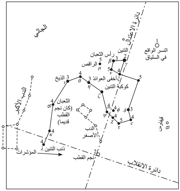 | الشكل (8) كوكبة التنين وأهم نجومها بالنسبة إلى الاعتدالين في دائرة البروج. |