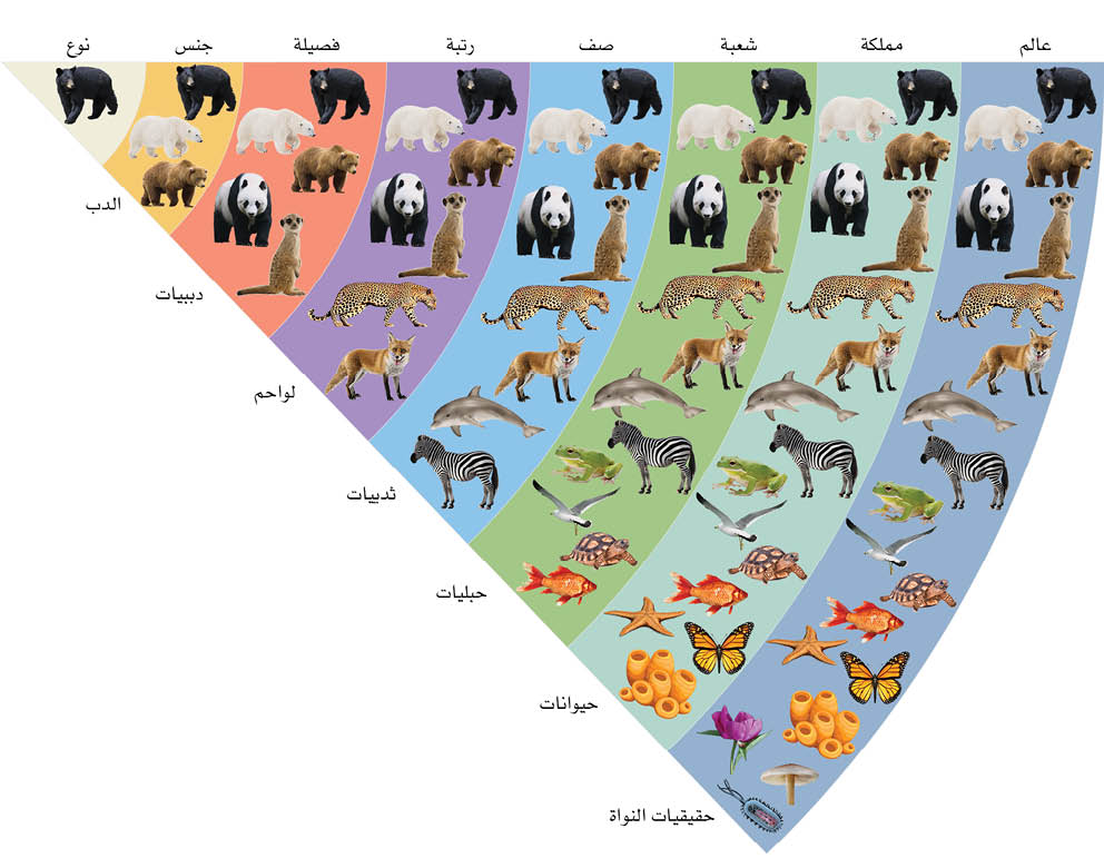 كل ذلك يعني أن التسمية الثنائية ليست تسمية فقط، بل هي أيضاً تصنيف للكائنات الحية ووضعها في مجموعات مختلفة تجمعها صفات مشتركة. وهكذا تقرر أن تُجمَع "الأنواع species" المختلفة التي تتصف بصفات مشتركة في "جنس genus" واحد، هو -في مثال الدببة- Ursus، والأجناس المختلفة التي تتصف بصفات مشتركة تُكَوِّن مجموعة أكبر تسمى فصيلة Family، هو في المثال "الدبيات Ursidae، والفصائل التي تحمل الصفات نفسها تُكَوِّن ما يسمى رتبة order، هو في المثال "اللواحم Carnivora"، والرتب تُجمَعُ عادة في صف Class، هو في المثال "الثدييات Mammalia"، والصفوف في شُعَب phyla، هو في المثال "الحبليات Chordata"، والشُعَب في مملكة Kingdom، هي في المثال "الحيوانات Animalia"، والممالك في عالَم Domain، هو في المثال "حقيقيات النواة Eukarya". ويمثل المخطط (1) فكرة التصنيف السابقة في مثال الدبيات.